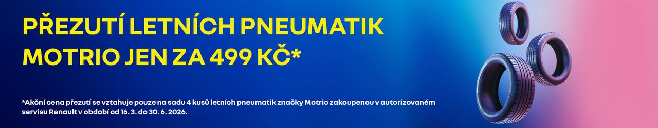 Nabídka platí do 30. 6. 2026, nebo do vyprodání zásob u participujících partnerů Renault. Všechny uvedené zákaznické ceny jsou včetně DPH a nezahrnují montáž. Renault Česká republika, a. s., si vyhrazuje právo na změnu uvedených cen, výše slev a technické specifikace výrobků bez předchozího upozornění. Nabídka je pouze informativní a není závaznou nabídkou k uzavření kupní smlouvy. Použité obrázky jsou ilustrativní.